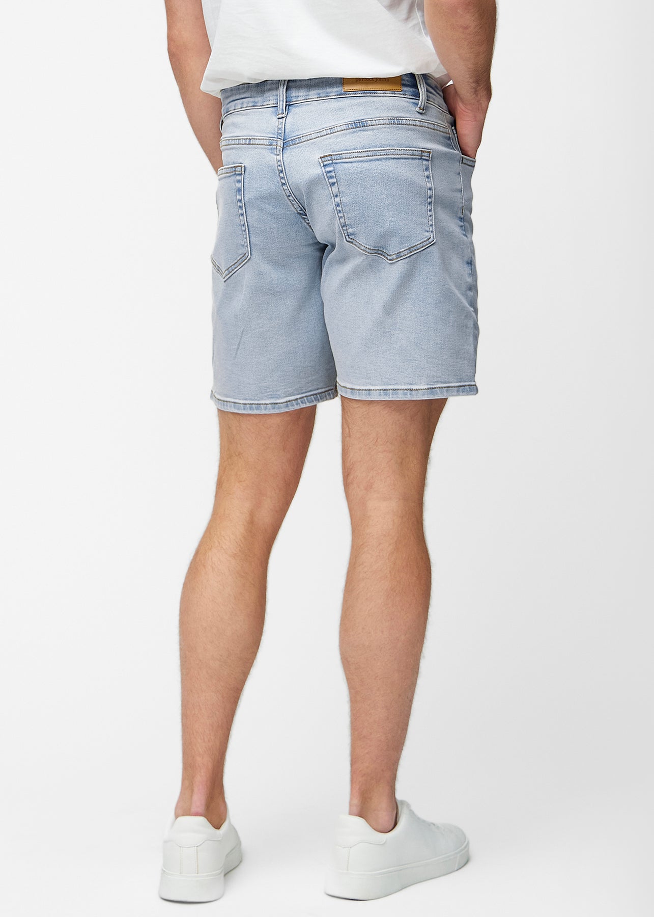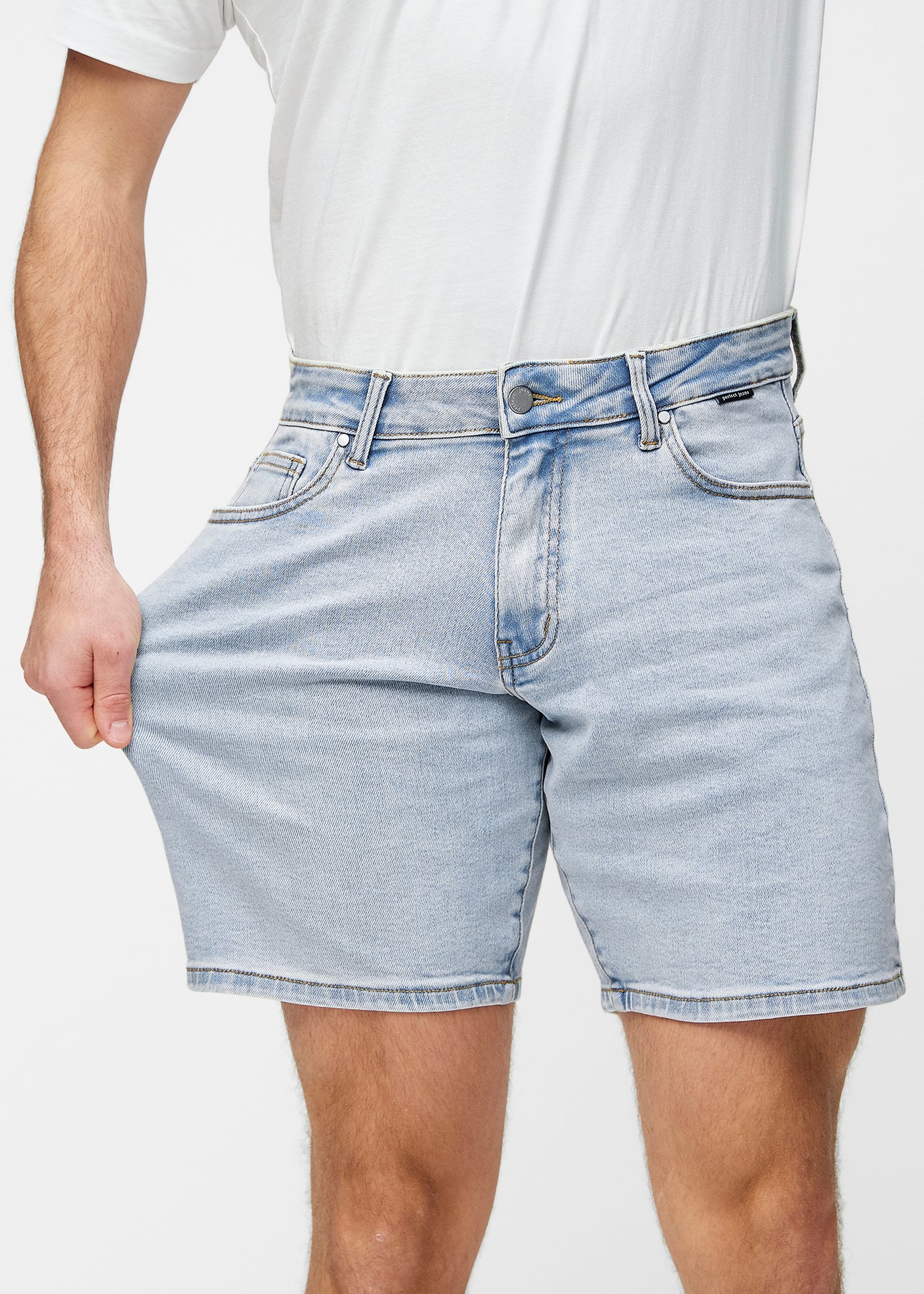 Perfect Shorts - Middle - Regular - Waves™ Perfect Shorts - Middle - Regular in Waves are light blue denim shorts for men with a light and classic look. The fit sits naturally at the hips and has a straight fit that leaves room around the thighs for a comfortable silhouette. The shorts are mid-length and reach just above the knee. The deep pockets at the front and back make them practical and suitable for everyday wear.