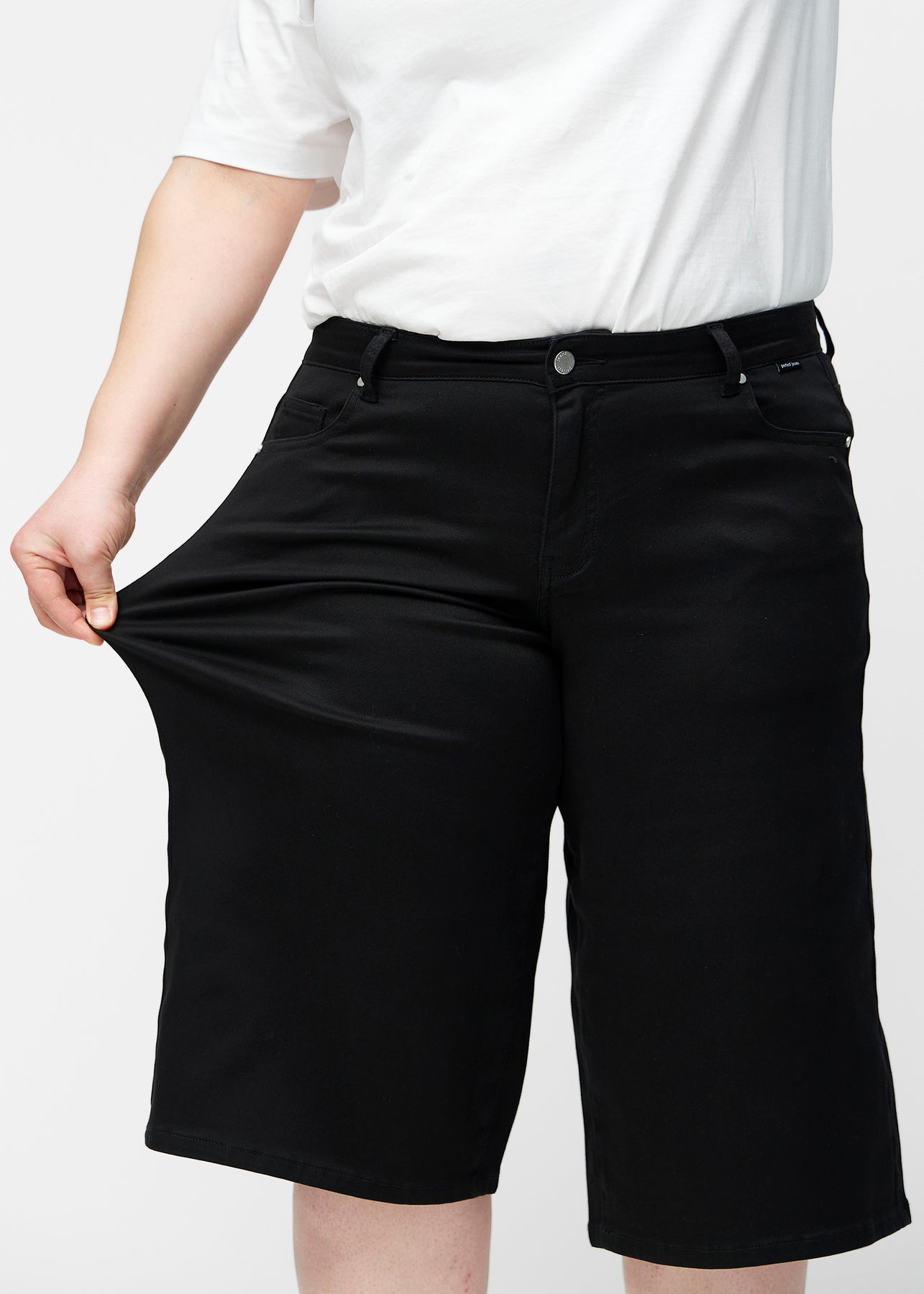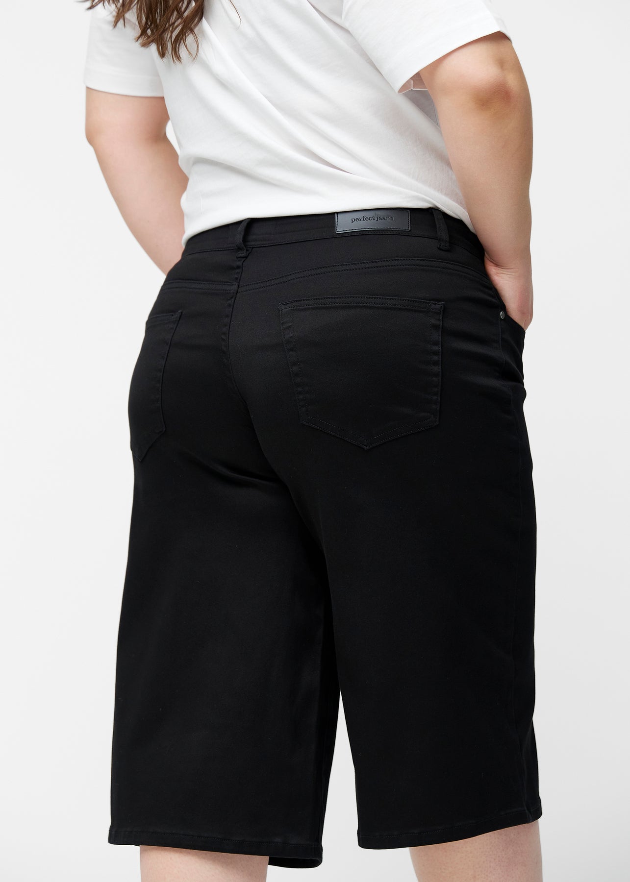 Løse, sorte capris i farven Ravens set fra siden på plus-size model, hvor den brede pasform og længden til lige under knæet er synlig.