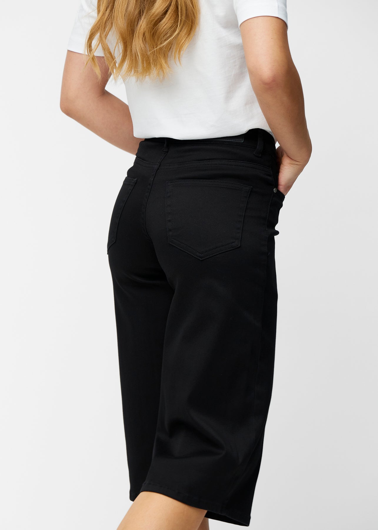 Løse, sorte capris i farven Ravens set fra siden på model, hvor den brede pasform og længden til lige under knæet er synlig.