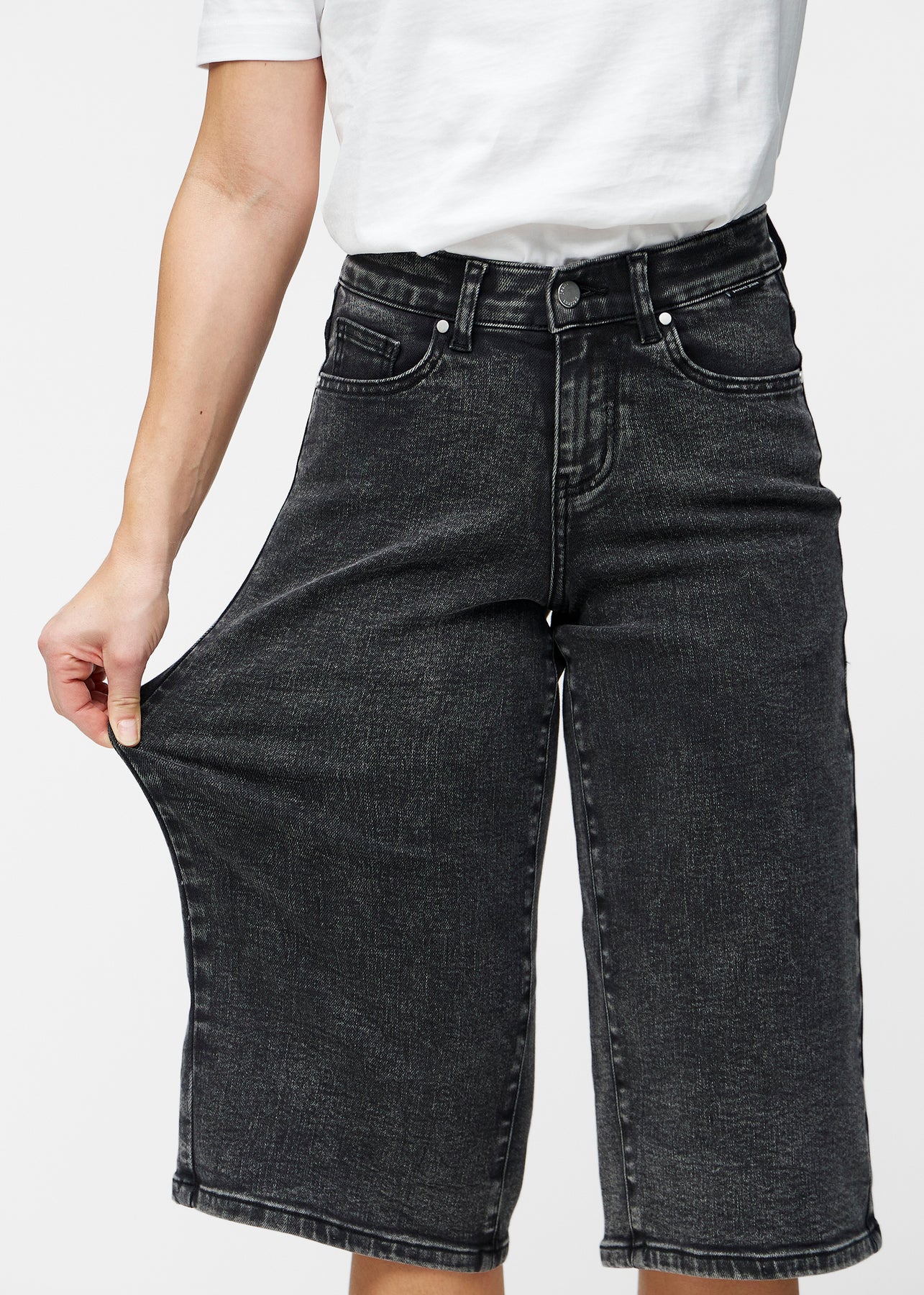 Model strækker de løse, mørkegrå denim capris i farven Shadows ved hoften for at vise materialets stretch.