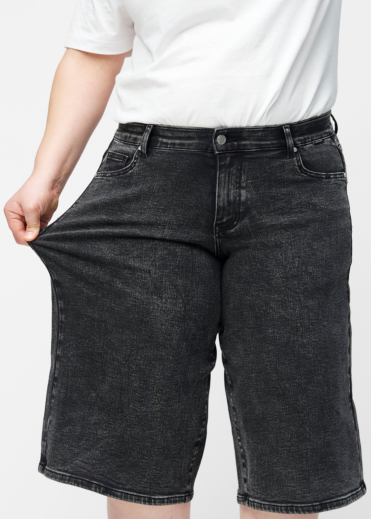 Plus-size model strækker de løse, mørkegrå denim capris i farven Shadows ved hoften for at vise materialets stretch.