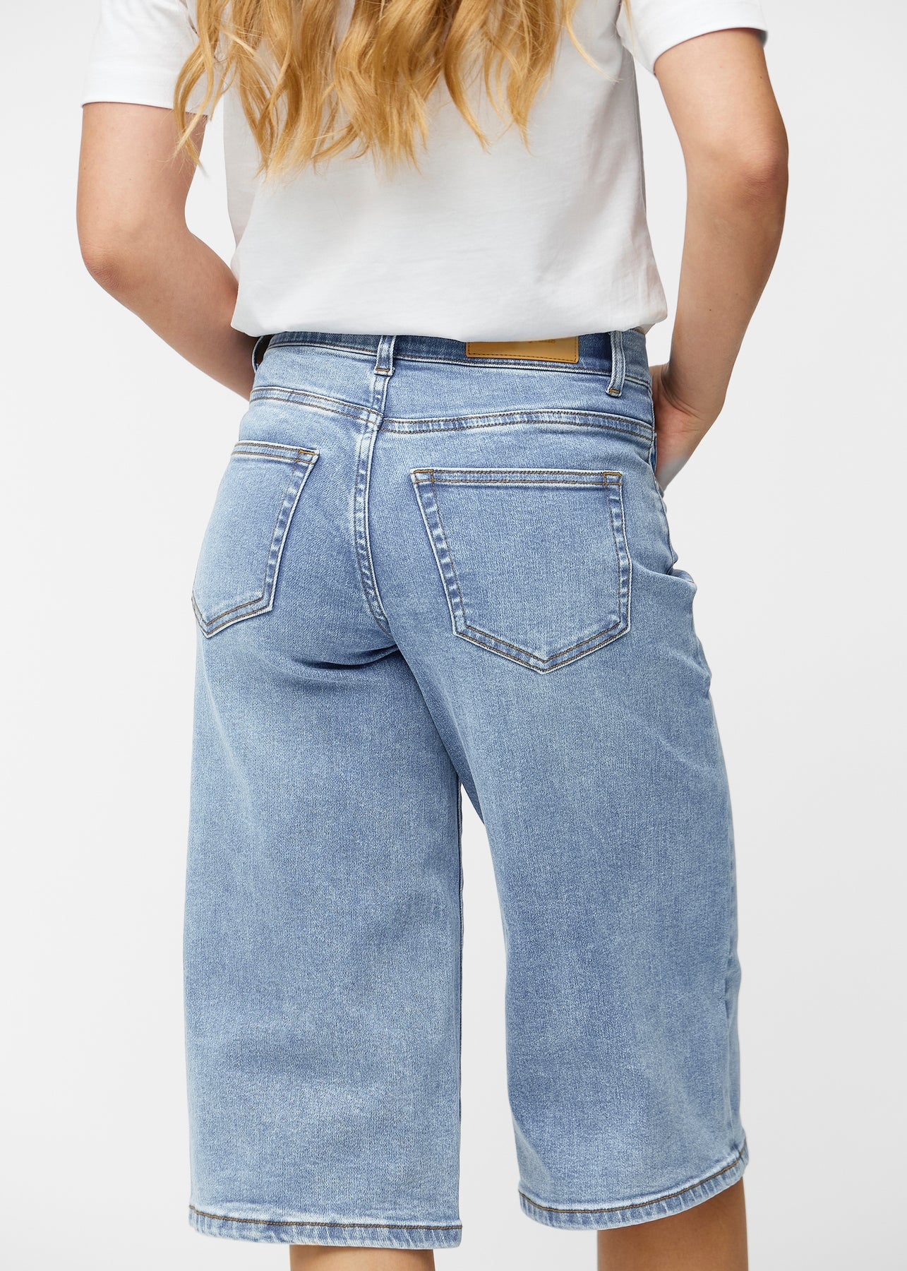 Perfect Capris - Loose in Waves are light blue denim capris for women with a light and modern look. The fit sits at the hips and falls loosely over the thighs for a relaxed silhouette. The capris reach just below the knee and are our loosest-fitting model. The wide shape provides air and freedom of movement, while the deep pockets at the front and back make them practical for everyday wear.