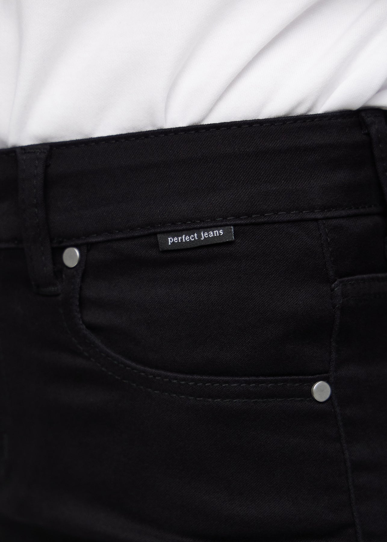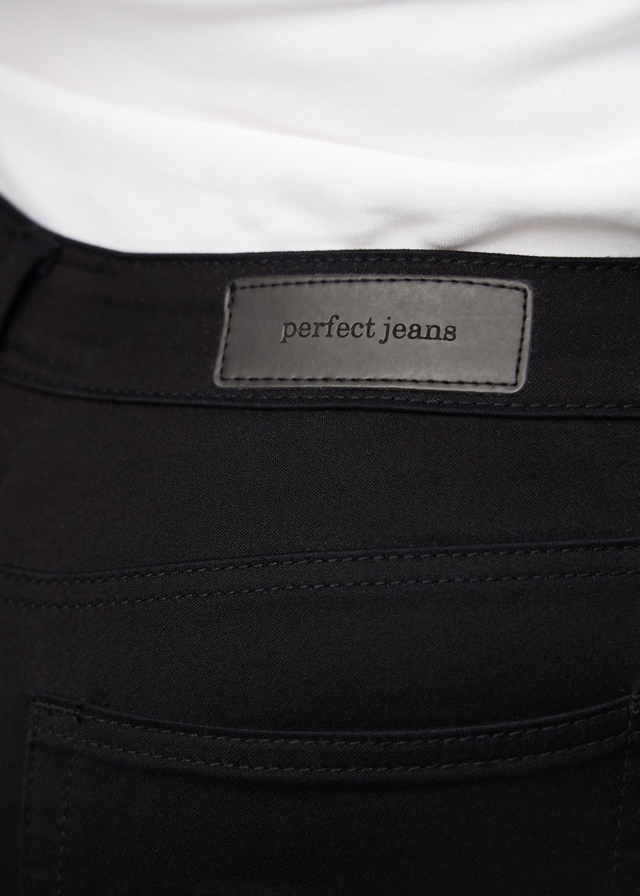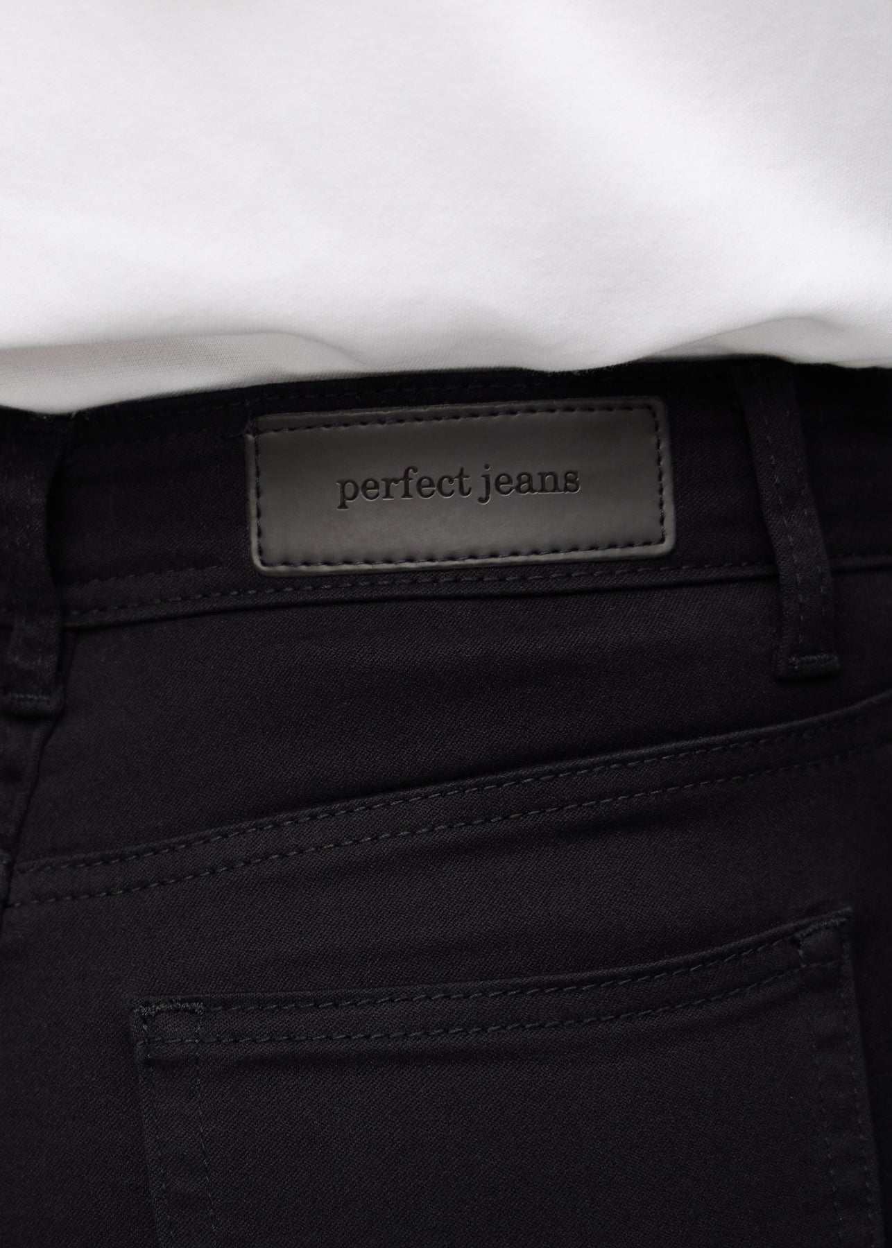 Nærbillede af sort jeansmateriale med Perfect Jeans logoetiket ved forlommekanten.