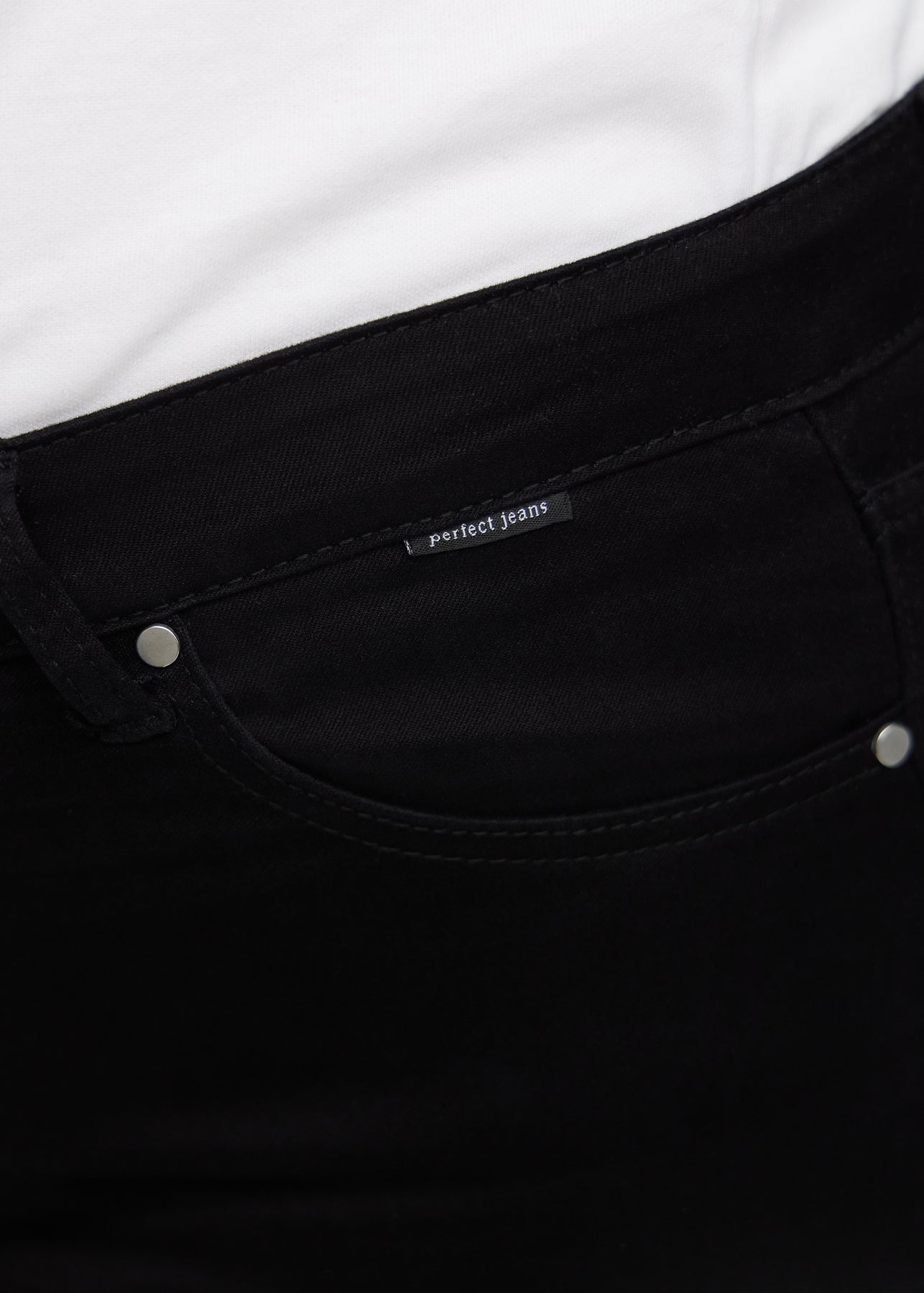 Nærbillede af sort jeansmateriale med Perfect Jeans logoetiket ved forlommekanten, på en plus-size model.