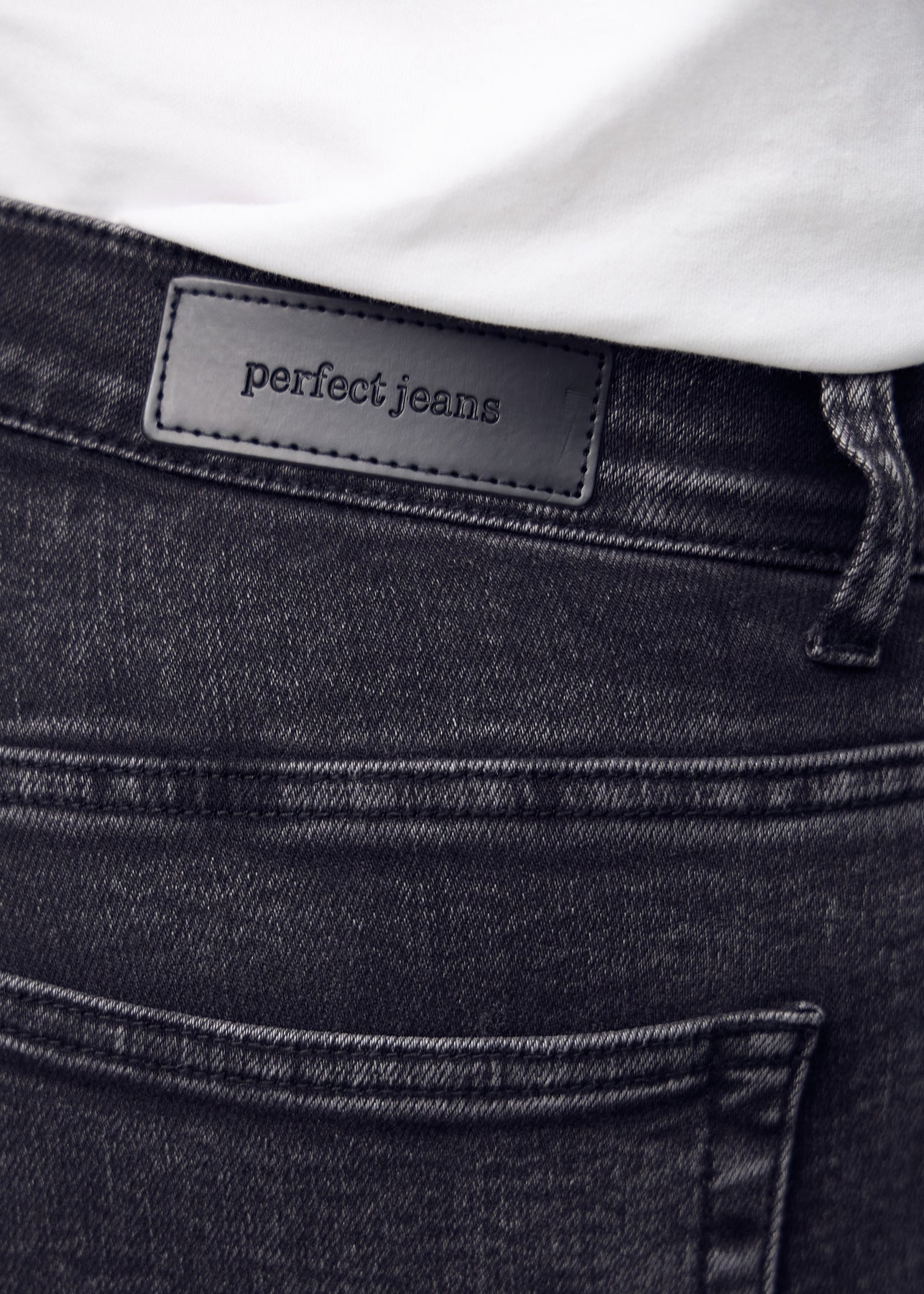 Nærbillede af mørkegrå denim med Perfect Jeans læderpatch bagpå i taljen.